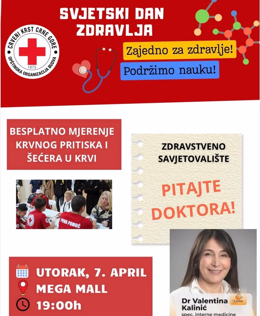 Povodom obilježavanja Svjetskog dana zdravlja, Opštinska organizacija Crvenog krsta Budva organizuje akciju preventivnih pregleda koja će se održati danas u Mega Mallu sa početkom u 19 sati.