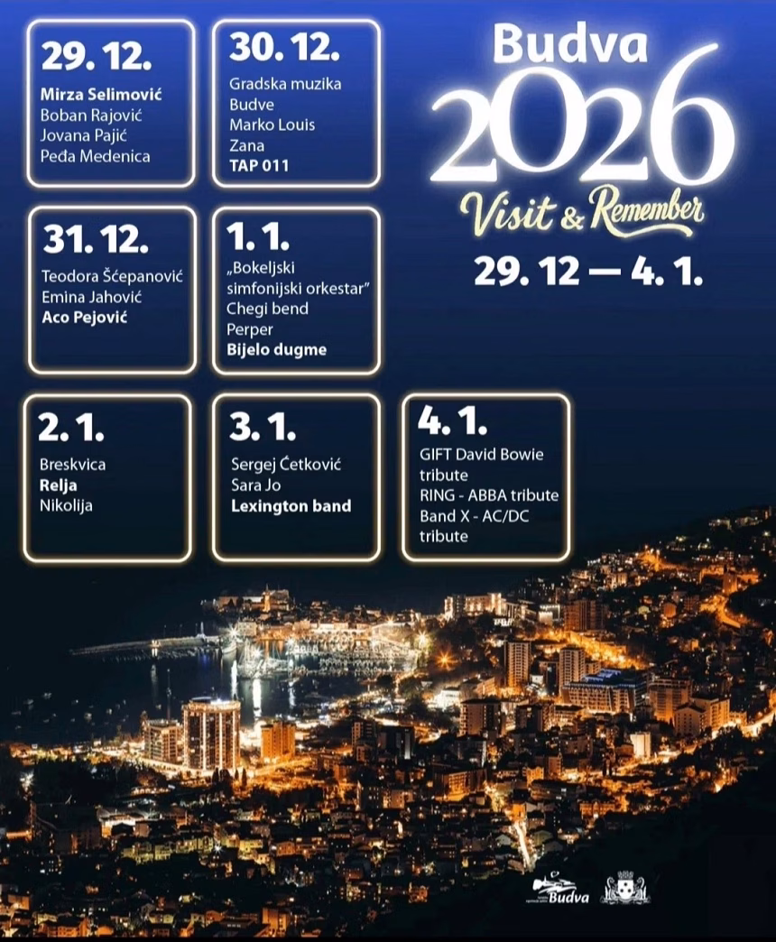 Turistička organizacija opštine Budva i opština Budva pozivaju vas da zajedno proslavimo ulazak u 2026. godinu uz muziku, radost i jedinstvenu atmosferu našeg grada.