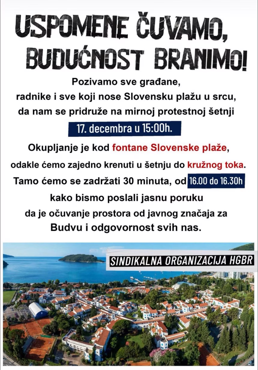Sindikalna organizacija HG „Budvanska rivijera“ AD Budva poziva sve zaposlene, građane Budve, kao i predstavnike medija da svojim prisustvom podrže borbu za zaštitu prava zaposlenih i budućnost Društva.