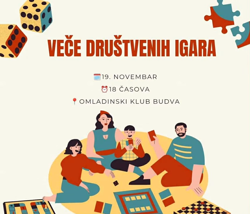Omladinski klub Budva poziva sve mlade sugrađane i ljubitelje društvenih igara na zabavno i interaktivno "Veče društvenih igara" koje će biti održano 19. novembra u 18h u prostorijama kluba.
