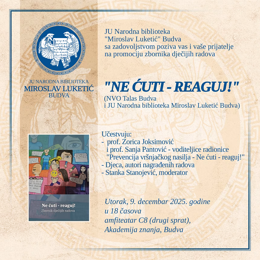 U utorak, 9. decembra sa početkom u 18 časova u amfiteatru C8 na drugom spratu Akademije znanja, JU Narodna Biblioteka Miroslav Luketić Budva i NVO Talas, Budva predstaviće zbornik dječijih radova "Ne ćuti – reaguj!".