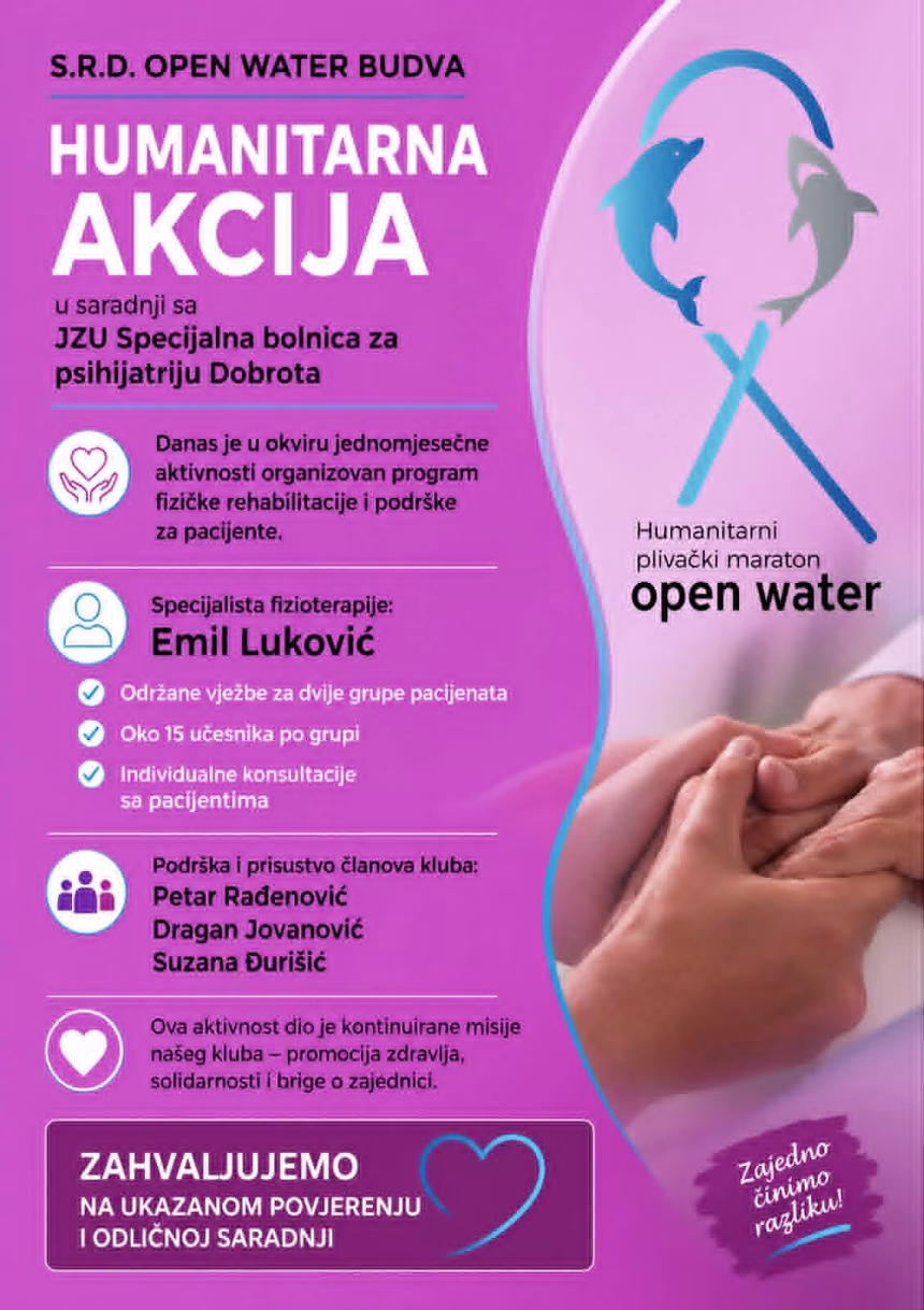 Iz organizacije su uputili veliku zahvalnost menadžmentu i osoblju JZU Specijalna bolnica za psihijatriju Dobrota na odličnoj saradnji, uz poruku da su ovakva partnerstva ključna za stvaranje humanijeg i zdravijeg okruženja za sve korisnike ustanove.