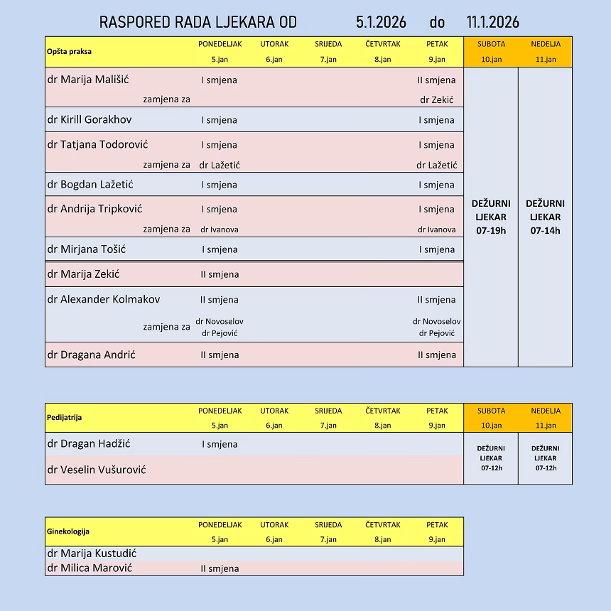 Raspored rada ljekara u Domu zdravlja Budva