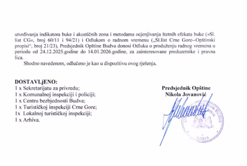 Predsednik Opštine Budva, Nikola Jovanović, donio je odluku kojom se odobrava produženje radnog vremena ugostiteljskim objektima na teritoriji opštine tokom predstojećih novogodišnjih i božićnih praznika. Prema ovoj odluci, zainteresovani preduzetnici i pravna lica moći će da rade do 03.00 časa iza ponoći tokom ključnih prazničnih datuma.