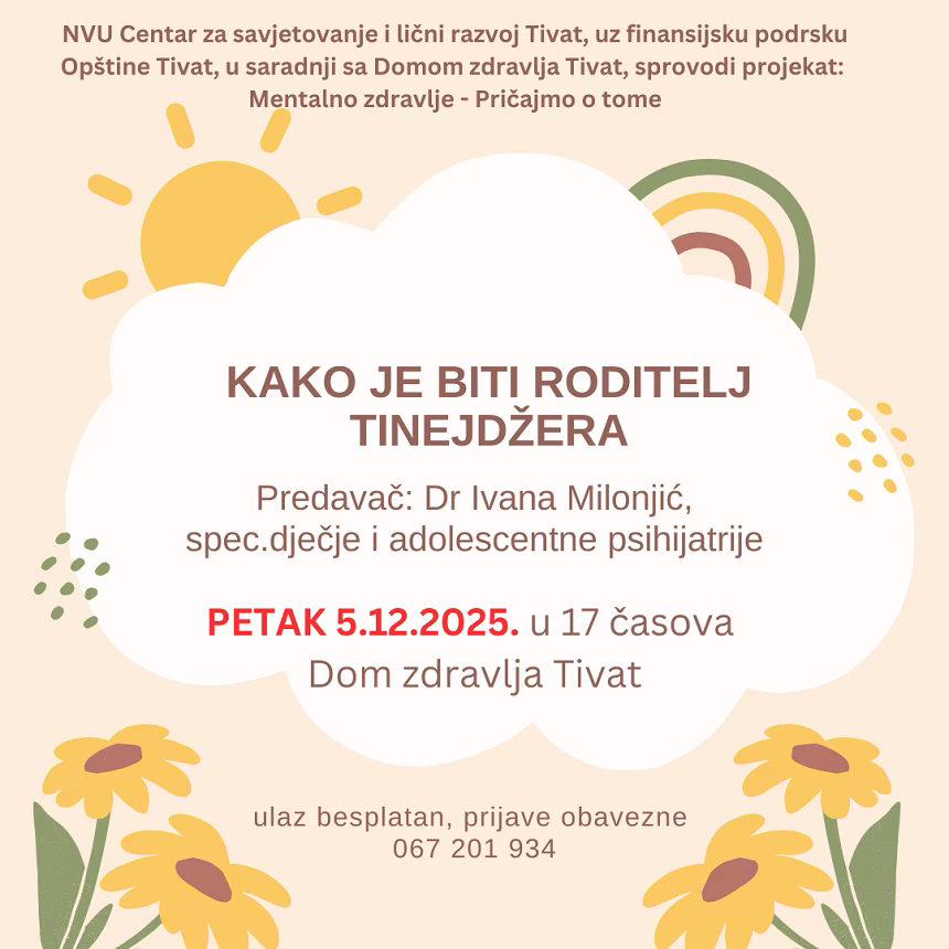 Radionica za roditelje pod nazivom “Kako je biti roditelj tinejdžera”, održaće se danas u 17 sati u Domu zdravlja Tivat a vodiće je dr Ivana Milonjić, dječji psihijatar, nacelnica Klinike za djecju i adolescentnu psihijatriju.