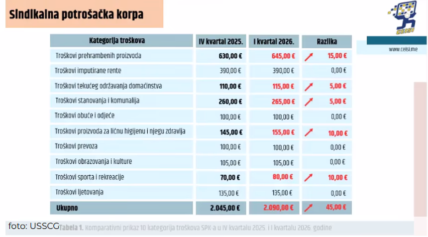 “U poređenju sa četvrtim kvartalom, kada je ova kategorija troškova iznosila 630 EUR, evidentiran je rast od 15 EUR, odnosno 2,38 odsto. Ovaj rast ukazuje na blagi, ali kontinuirani trend poskupljenja osnovnih prehrambenih artikala, uprkos mjerama koje država sprovodi kroz akcije ograničavanja cijena odabranih proizvoda”, rekli su iz USSCG.