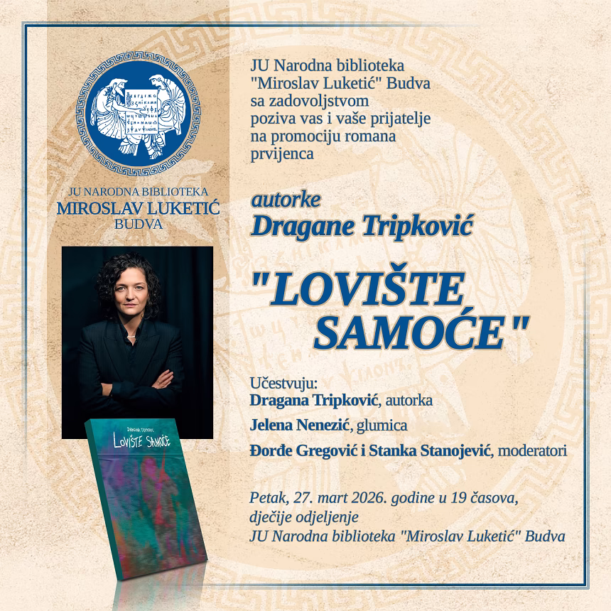 U organizaciji JU Narodna biblioteka „Miroslav Luketić“ Budva u petak, 27. marta sa početkom u 19 časova na dječijem odjeljenju biblioteke predstavićemo roman-prvijenac crnogorske pjesnikinje i dramske spisateljice Dragane Tripković „Lovište samoće”.
