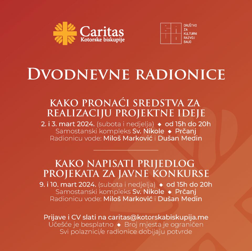 "U pitanju je prva od dvije planirane radionice koje se realizuju u saradnji Caritasa Kotorske biskupije i Društva za kulturni razvoj „Bauo“, a naredna je posvećena pisanju prijedloga projekata za javne konkurse (ministarstva, opštine), i održaće se tokom sljedećeg vikenda (9. i 10. mart), u istom terminu i na istom mjestu", zaključuje se u saopštenju.