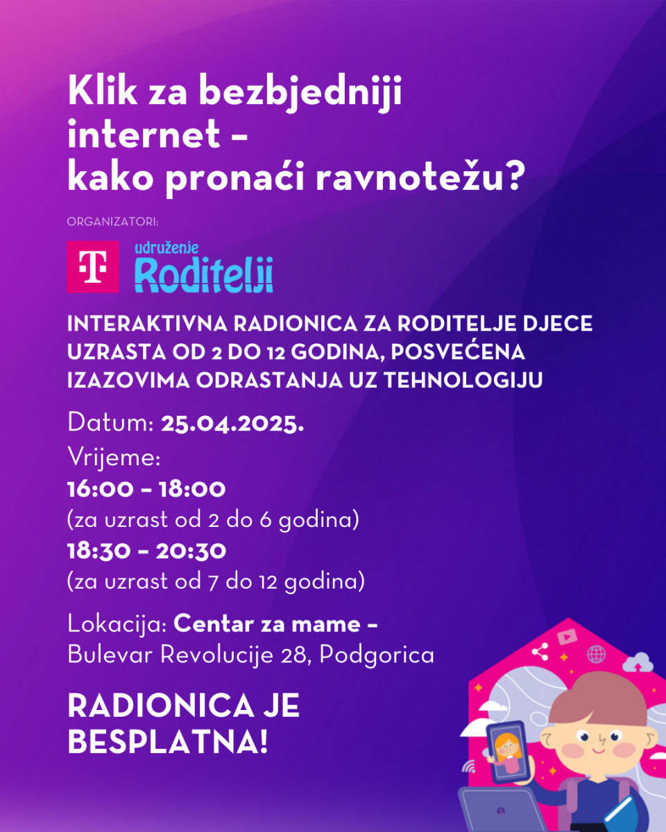 Udruženje Roditelji i Crnogorski Telekom organizovaće seriju besplatnih interaktivnih radionica za roditelje djece uzrasta od dvije do 12 godina, na temu Klik za bezbjedniji internet – kako pronaći ravnotežu?