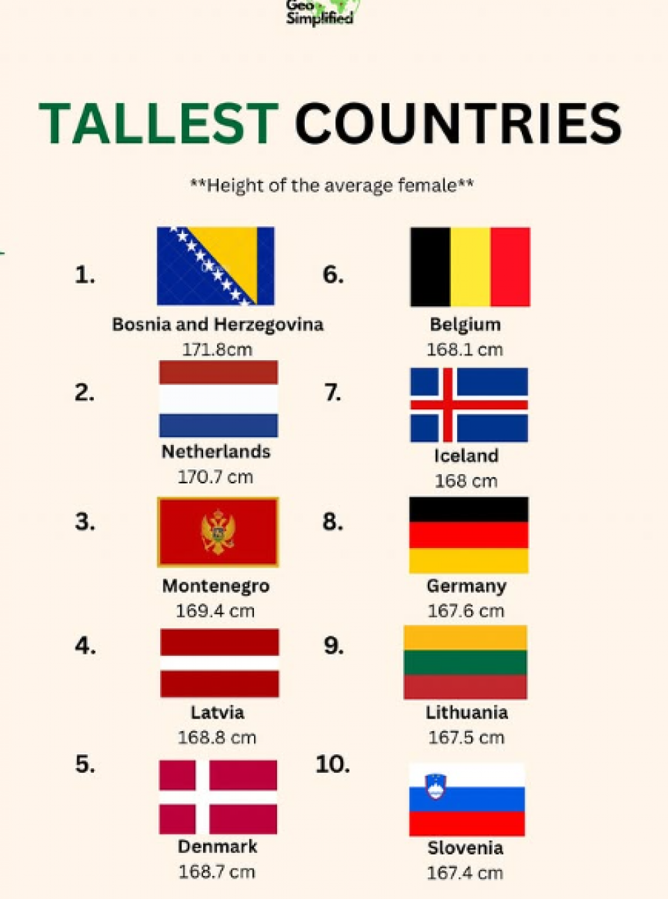 Geo Simplified objavio je listu zemalja prema prosječnoj visini žena, a dame iz Crne Gore zauzele su treće mjesto. Njihova prosječna visina je 169,4 centimetara.