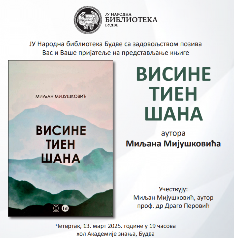 JU Narodna biblioteka Budve će večeras sa početkom u 19 časova u holu Akademije znanja prirediti predstavljanje zbirke poezije „Visine Tien Šana“, autora Miljana Mijuškovića. Učesnici programa su autor Miljan Mijušković, prof. dr Drago Perović i moderatorka Anđe Todorović.