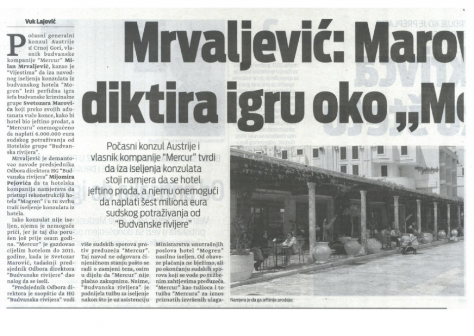 Hotelska grupa "Budvanska rivijera" oglasila se povodom teksta objavljenog u štampanom izdanju dnevnog lista „Vijesti“, pod naslovom „Mrvaljević: Marović još diktira igru oko ‘Mogrena’“.