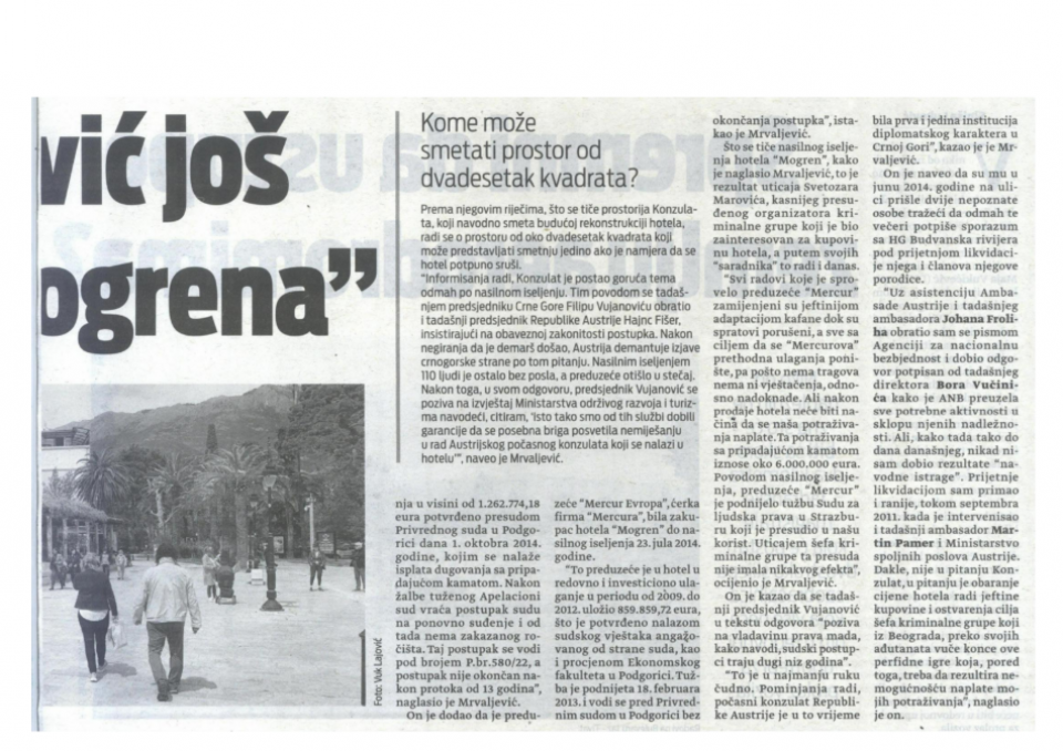 S tim u vezi, navodi g. Milana Mrvaljevića da će doći do prodaje hotela „Mogren“ i dovođenje u vezu osuđenog lica Svetozara Marovića s istom predstavljaju jeftini populizam i domen naučne fantastike.