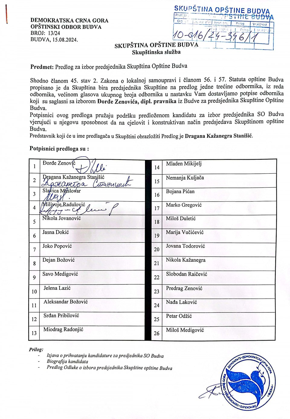 Predsjednik OO Demokratske Crne Gore Budva Krsto Radović danas je skupštinskoj službi podnio predlog odluke o izboru predsjednika SO Budva i na današnjem presu saopštio da je njihov kandidat za tu funkciju Đorđe Zenović.