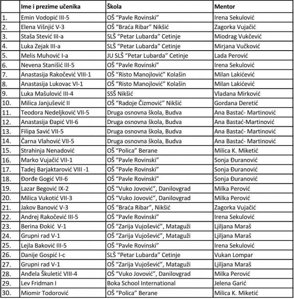 Članovi žirija bili su Ivana Ćupić, direktorica JU Muzeji i galerija, Podgorica, Dragan Berilažić, nadzornik za likovnu kulturu u Zavodu za školstvo i Vladana Vučinić, kreativna direktorica RTCG.