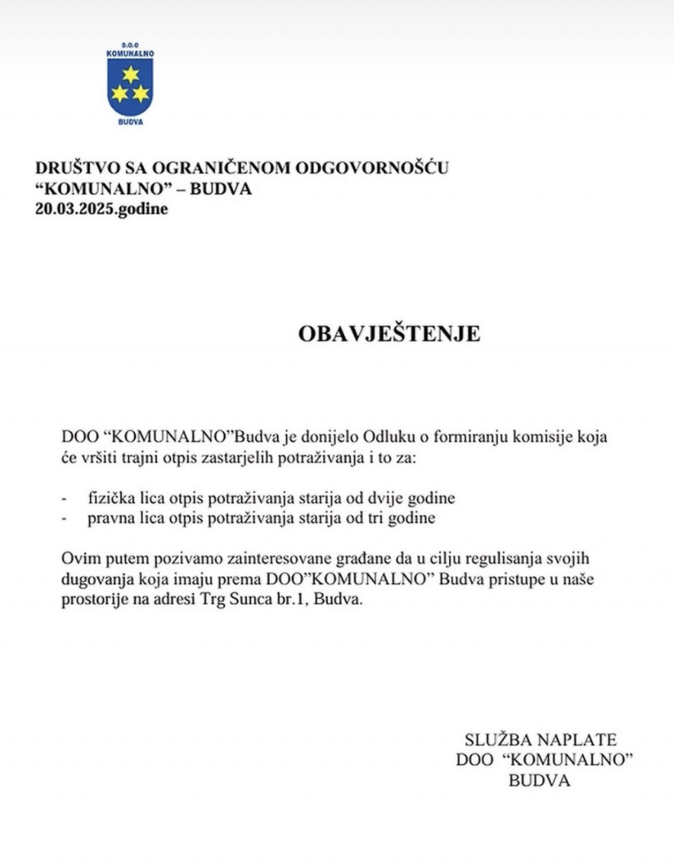 DOO „Komunalno” Budva je donijelo Odluku o formiranju komisije koja će vršiti trajni otpis zastarjelih potraživanja.