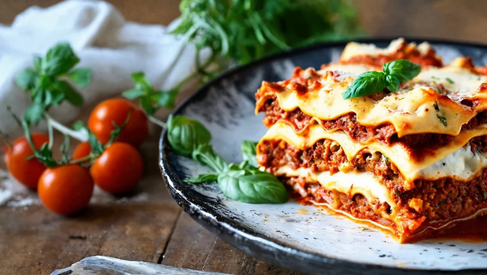 400 g kora za lazanje, 0,5 kg mljevenog mesa, 0,5 l pasate, 0,5 l crnog vina, veća glavica crnog luka, bijeli luk, peršun, so, biber, origano, muskatni oraščić, bosiljak, parmezan, 25 g maslaca, tri kašike brašna, 0,6 l mlijeka.