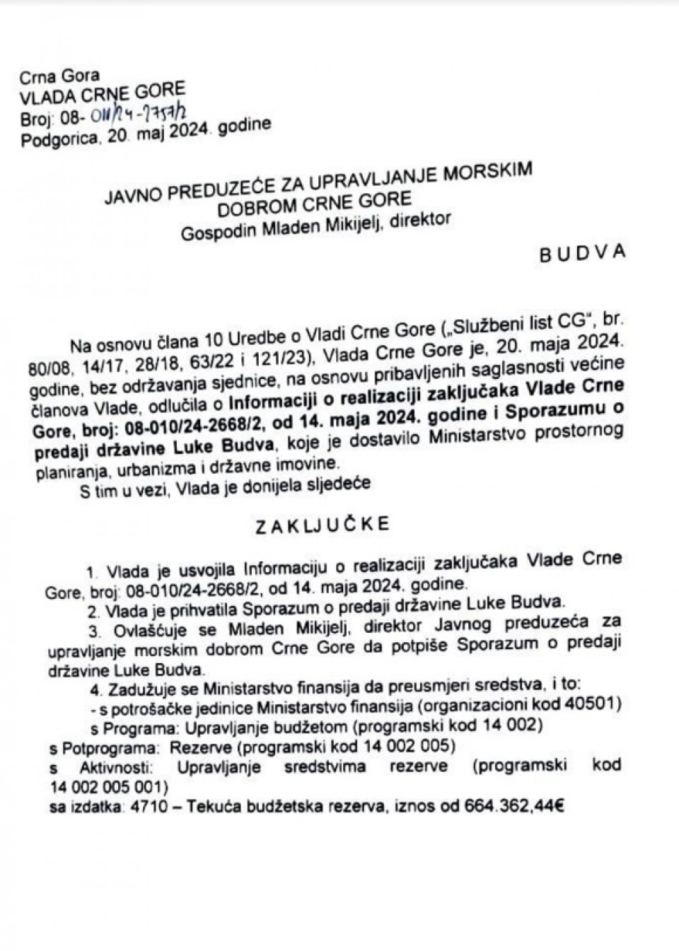 Zaključak Vlade za Luku Budva