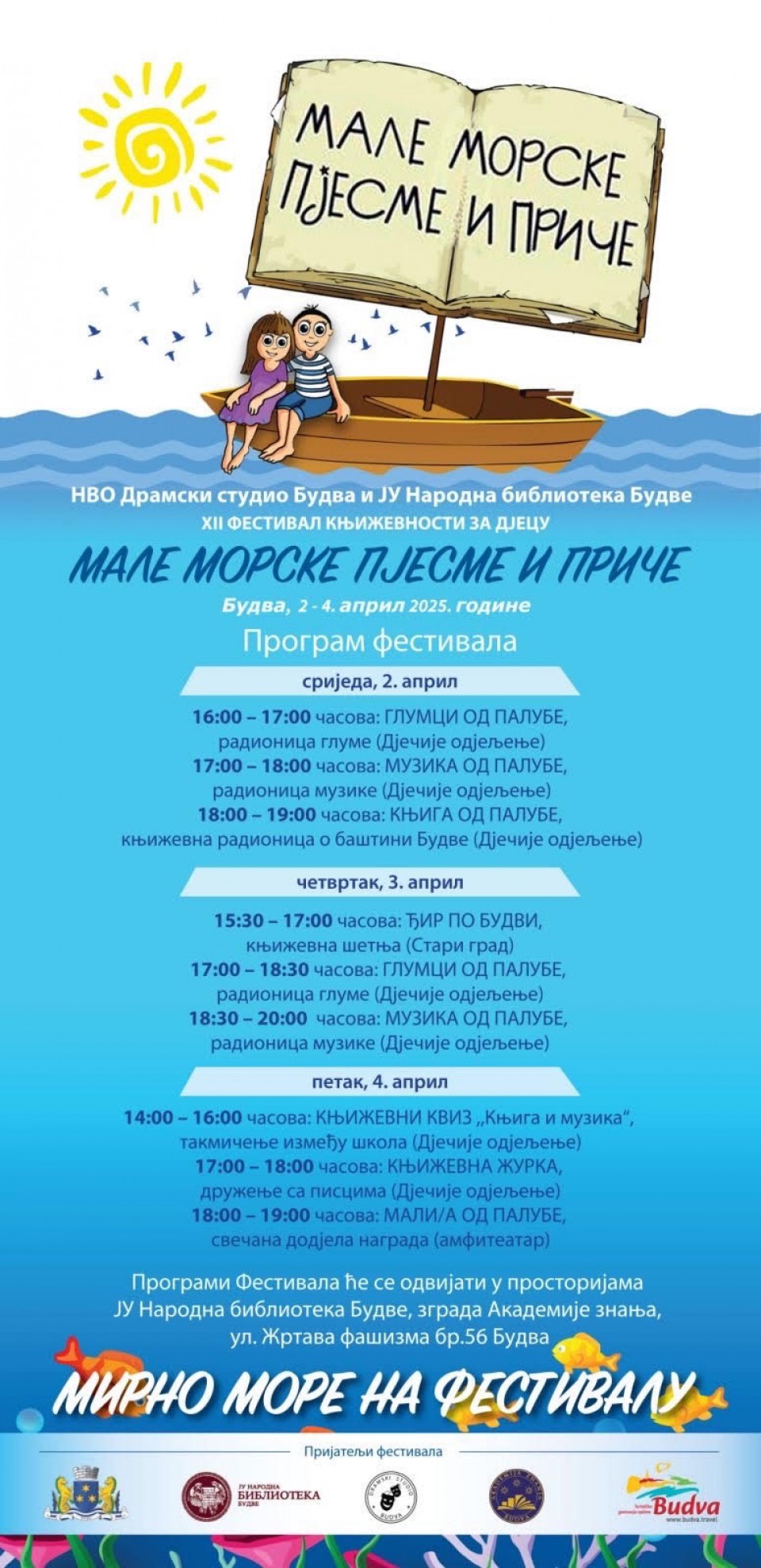 Budva će od 2. do 4. aprila biti domaćin XII Festivala književnosti za djecu „Male morske pjesme i priče“, u organizaciji NVO Dramski studio Budva i JU Narodna biblioteka Budve. Festival donosi bogat program posvećen najmlađima, kroz radionice glume i muzike, književne šetnje i kvizove.