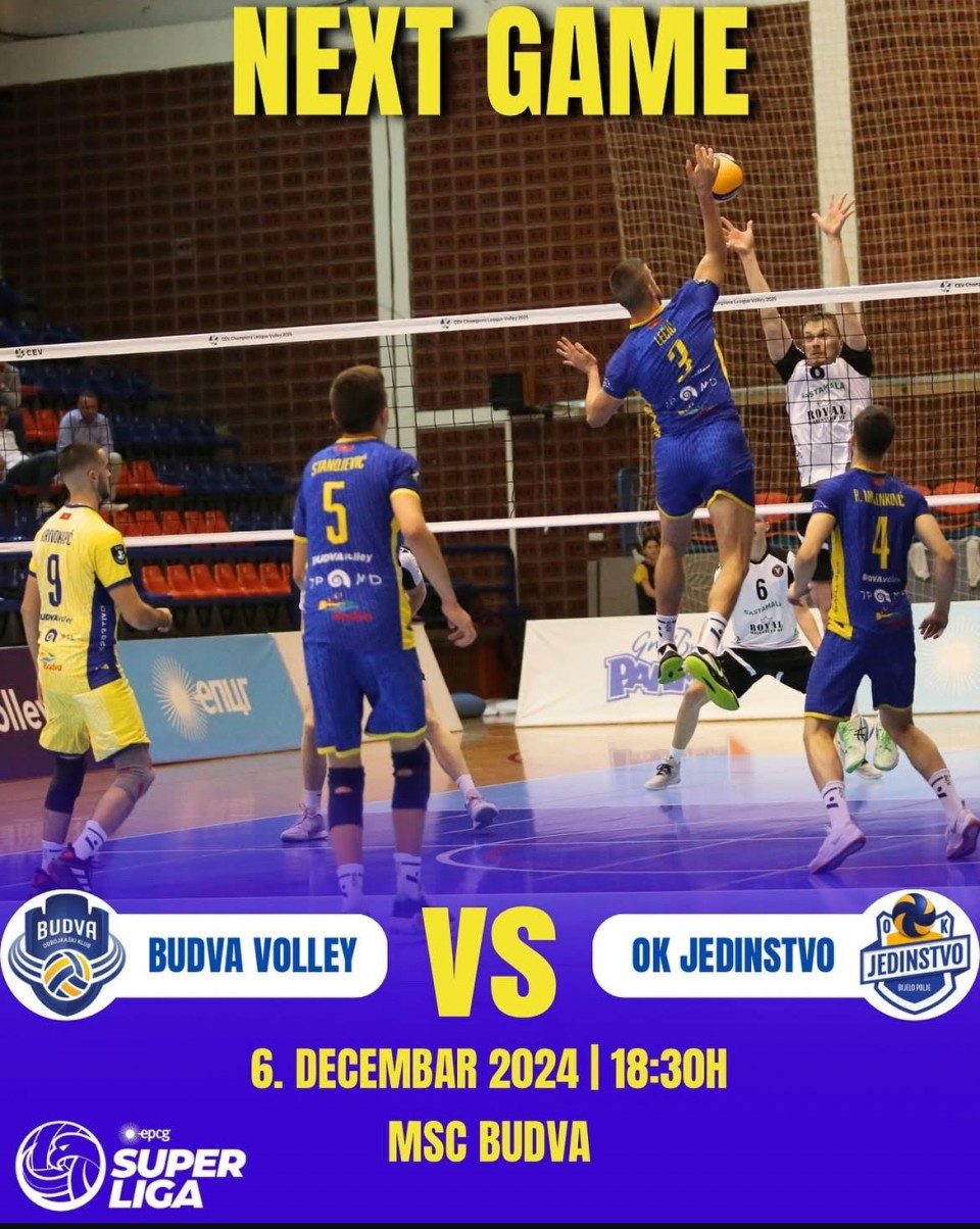 U posljednjem kolu jesenjeg dijela sezone, odbojkaši Budve će u petak, 6. decembra, u 18:30 časova u Mediteranskom sportskom centru ugostiti ekipu Jedinstva. Nakon dvije zapažene pobjede, domaći tim će pokušati da nizom upotpuni uspješnu polusezonu. Utakmica će biti prenošena na kanalima Adriatic sport.
