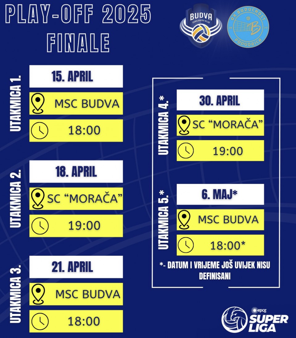 Finalna serija plej-ofa EPCG Superlige počinje večeras, a u prvoj finalnoj utakmici naši odbojkaši će od 18:00, u Mediteranskom sportskom centru, dočekati ekipu Budunosti i boriti se za novu titulu.