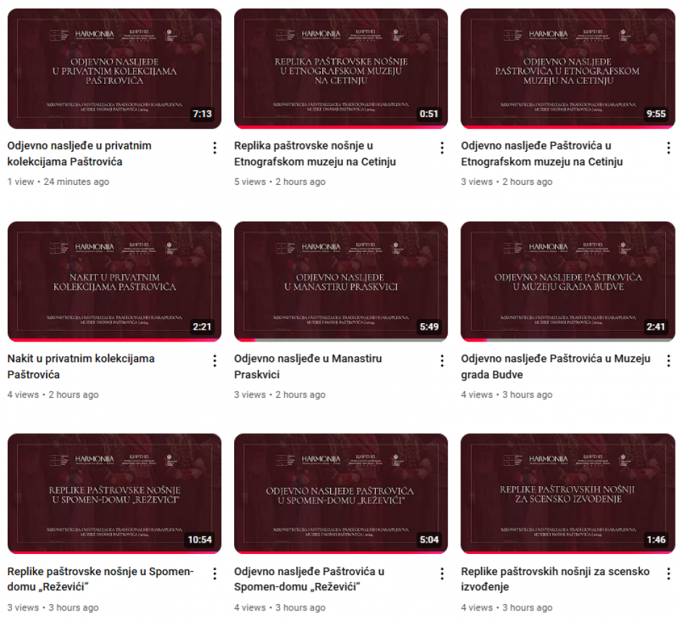 1. Izložba fotografija „Paštrovići na sceni: XX vijek“ - https://www.youtube.com/watch?v=auSliMMk174&t=2s 2. Replike paštrovskih nošnji za scensko izvođenje - https://www.youtube.com/watch?v=QGNXlGYm6B4&t=3s 3. Odjevno nasljeđe Paštrovića u Spomen-domu „Reževići“ - https://www.youtube.com/watch?v=1sWqO9iQLZM&t=2s 4. Replike paštrovske nošnje u Spomen-domu „Reževići“ - https://www.youtube.com/watch?v=1ODEC0j5Bp4&t=3s 5. Odjevno nasljeđe Paštrovića u Muzeju grada Budve - https://www.youtube.com/watch?v=8fq8JX8u8Ao&t=3s 6. Odjevno nasljeđe Paštrovića u Etnografskom muzeju na Cetinju - https://www.youtube.com/watch?v=vw-0IZhQkhc&t=2s 7. Replika paštrovske nošnje u Etnografskom muzeju na Cetinju - https://www.youtube.com/watch?v=ZtqS_cKFvoQ 8. Odjevno nasljeđe u Manastiru Praskvici - https://www.youtube.com/watch?v=TdfJvEBud3I&t=26s 9. Odjevno nasljeđe u privatnim kolekcijama Paštrovića - https://www.youtube.com/watch?v=EarAaxv_zic&t=27s 10. Nakit u privatnim kolekcijama Paštrovića - https://www.youtube.com/watch?v=OW2_EAEg81E&t=18s