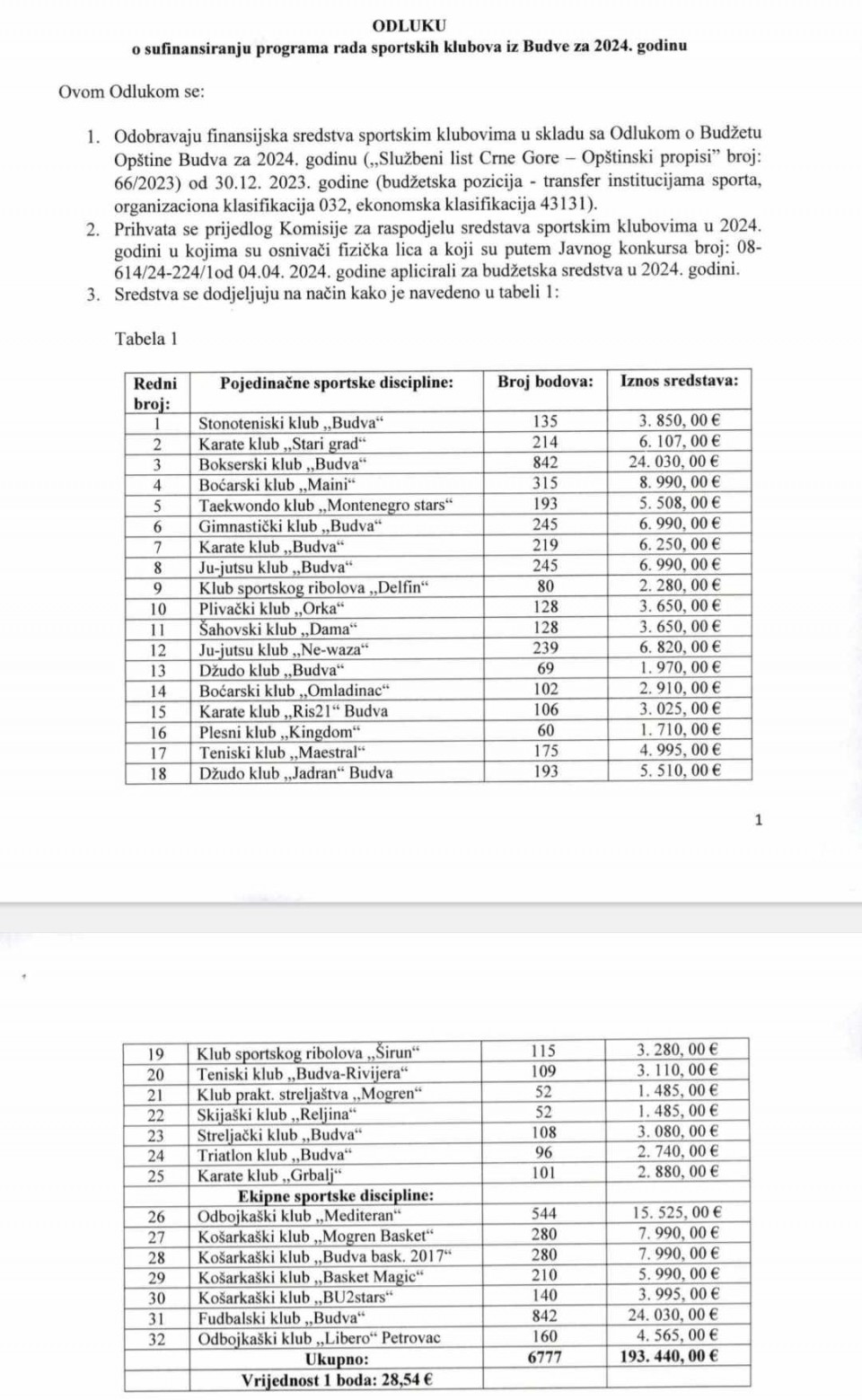 Ovom odlukom, obuhvaćena su 32 sportska kluba iz Budve.