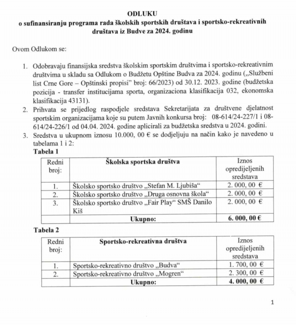 Na osnovu Odluke o bližim uslovima, načinu, postupku i kriterijumima za dodjelu sredstava iz budžeta Opštine Budva sportskim subjektima, potpredsjednica Opštine Budva donijela je Odluku o sufinansiranju programa rada sportsklh klubova, školskih sportskih drustava i sportsko-rekreativnih društava iz Budve za 2024. godinu