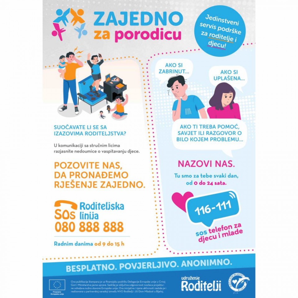 Besplatna SOS Roditeljska linija udruženja Roditelji- 080 888 888 dostupna je roditeljima/starateljima/hraniteljima i svim licima koji su u kontaktu sa djecom, svakog radnog dana od 9h do 15h. SOS telefon za djecu i mlade JU Dječiji Dom Mladost omogućava poverljivi savjetodavni razgovor, podršku ili pomoć djeci ili mladima, a dostupna je putem telefona 116 111.