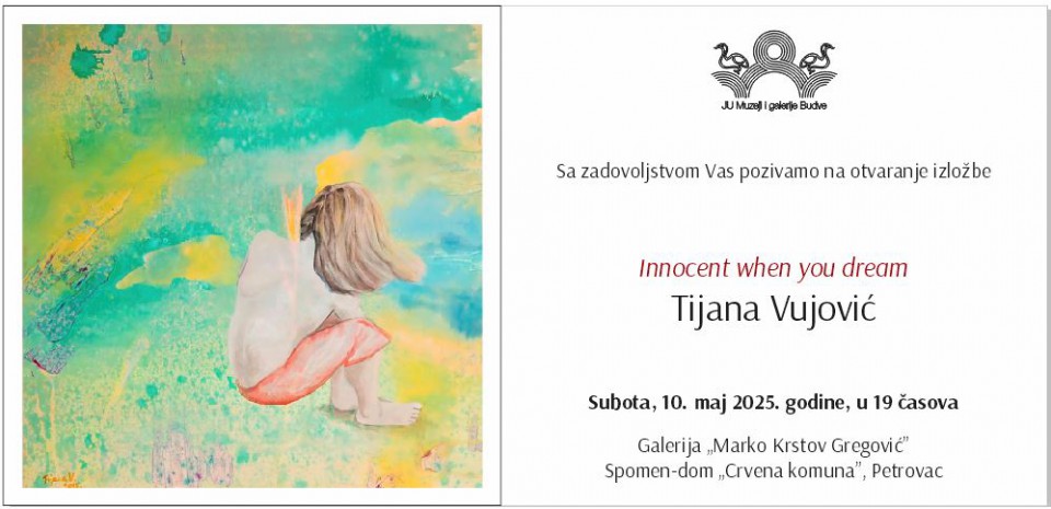 U organizaciji JU Muzeji i galerije Budve u galeriji „Marko K. Gregović“ Spomen doma „Crvena komuna“ u Petrovcu, u subotu 10. maja sa početkom u 19h biće otvorena izložba umjetnice Tijane Vujović pod nazivom Innocent when you dream.