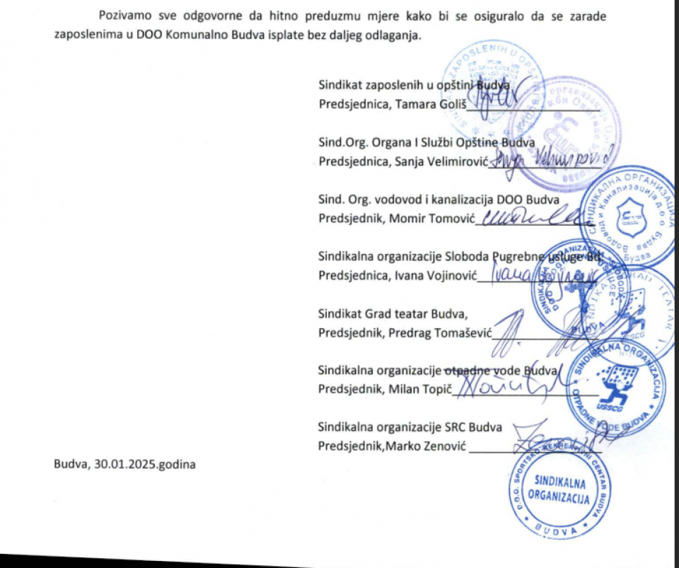 Sindikati pozivaju sve odgovorne da hitno preduzmu mjere kako bi se osiguralo da se zarade zaposlenima u DOO Komunalno Budva isplate bez daljeg odlaganja.