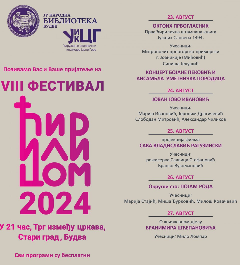 Pete večeri 8. festivala Ćirilicom na Trgu između crkava, večeras od 21 čas budvanska publika imaće priliku da posluša predavanje prof. dr Mila Lompara pod nazivom "O književnom djelu Branimira Šćepanovića", jednog od najprevođenijih srpskih i jugoslovenskih pisaca, saopšteno je iz PR službe Festivala.