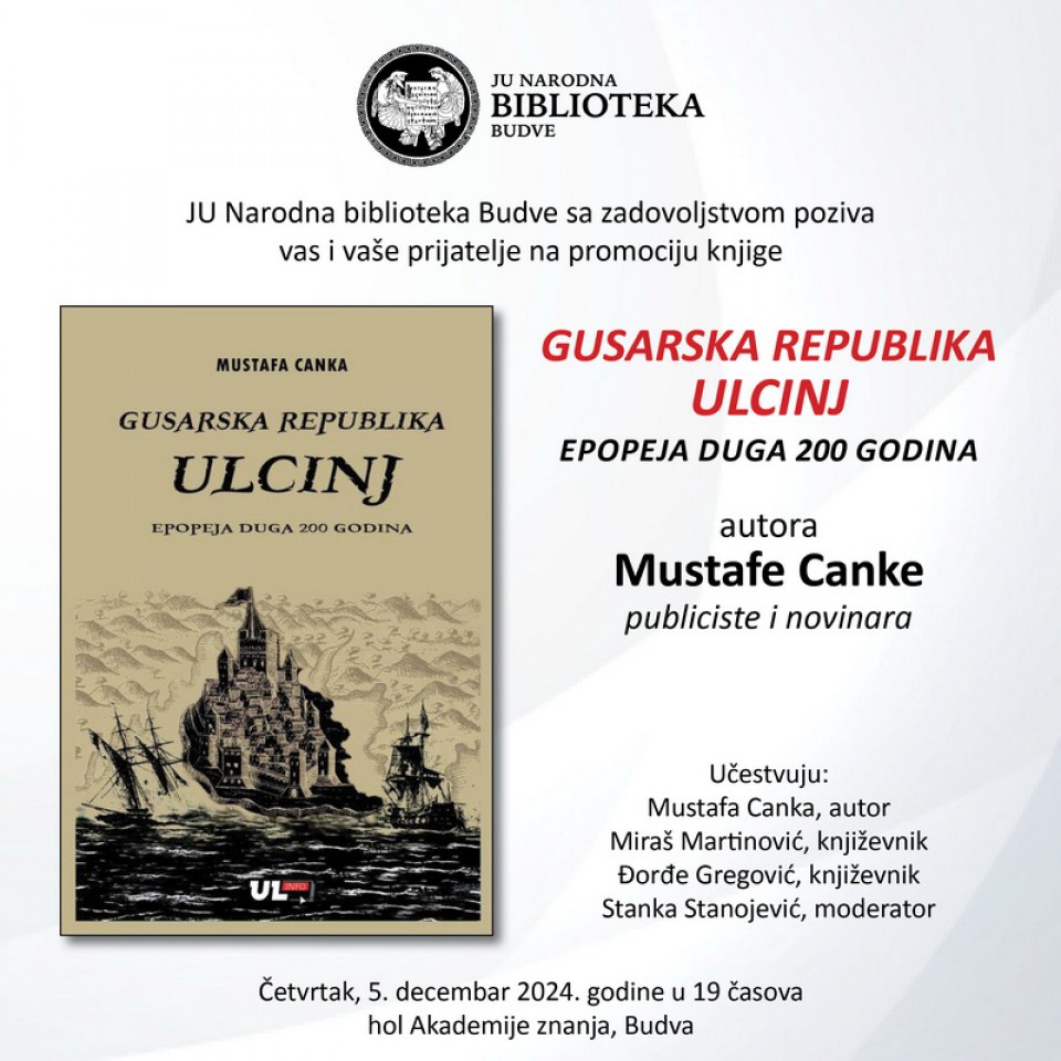 Promocija knjige „Gusarska republika Ulcinj“ autora Mustafe Canke, u organizaciji Narodne biblioteke Budve, održava se sjutra u holu Akademije znanja, sa početkom u 19:00. Govoriće književnici Miraš Martinović i Đorđe Gregović i autor knjige, dok je moderator večeri Stanka Stanojević.