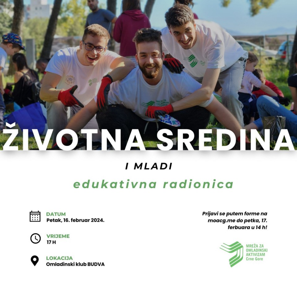 Omladinski klub Sekretarijata za društvene djelatnosti Opštine Budva poziva sve mlade entuzijaste i entuzijastkinje Budve da učestvuju u edukativnoj radionici „Životna sredina i mladi”, koju organizuje Mreža za omladinski aktivizam Crne Gore u petak, 16. februara sa početkom u 17 časova u Omladinskom klubu Budva.