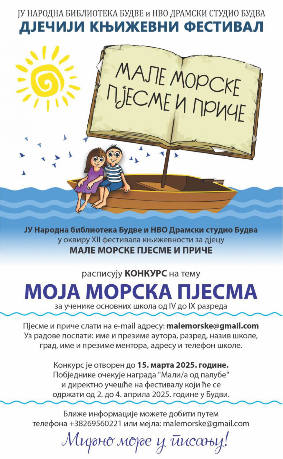 U okviru XII festivala književnosti za djecu „Male morske pjesme i priče“ JU „Narodna biblioteka Budve“ i NVO „Dramski studio Budva“ raspisuju Konkurs za učenike osnovnih škola od IV do IX razreda na temu „Moja morska pjesma“.