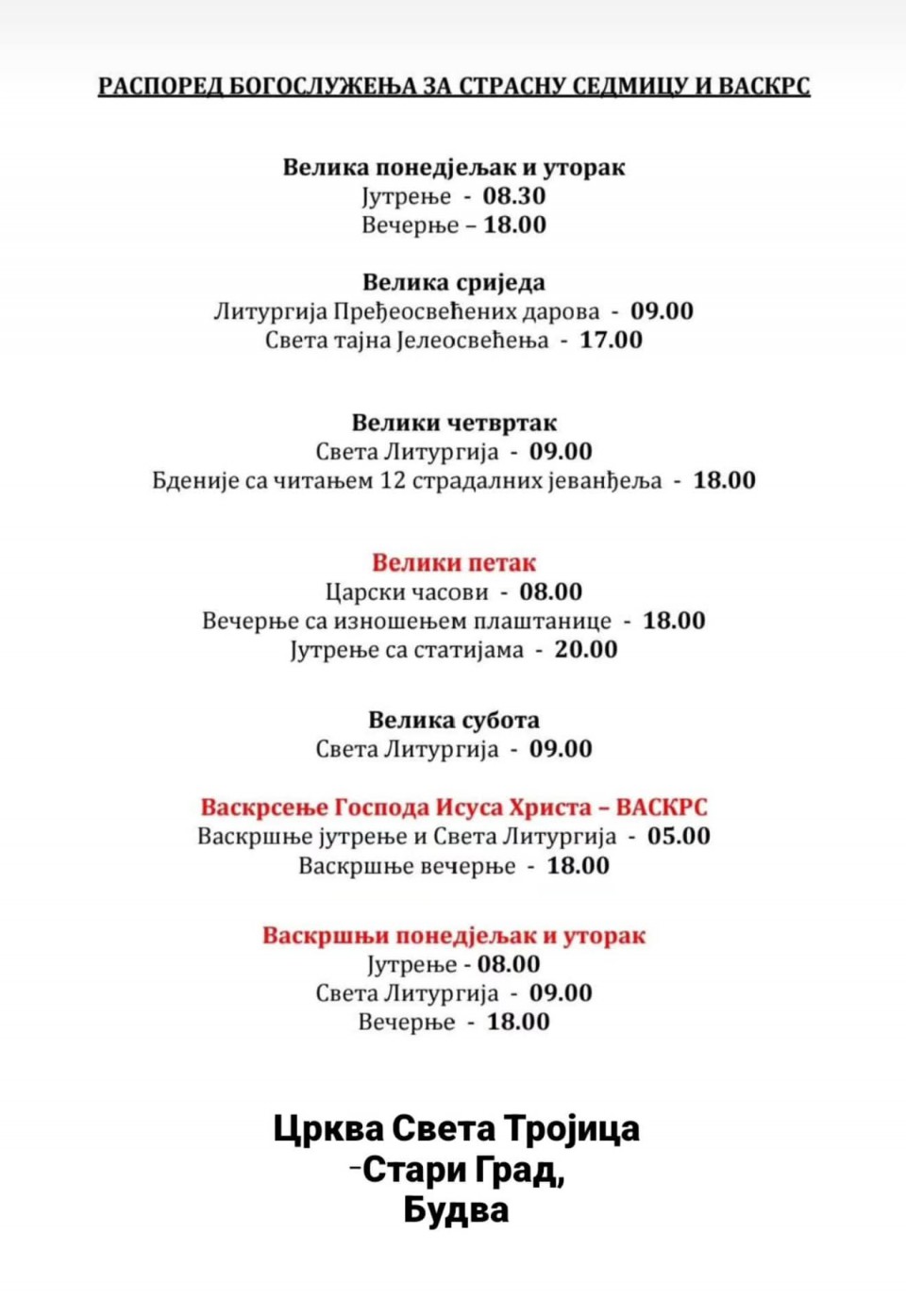 Tokom sedmice, a u susret najraodsnijem hrišćanskom prazniku u hramu Svete Trojice u Starom gradu bogoslužiće se po sljedećem rasporedu: