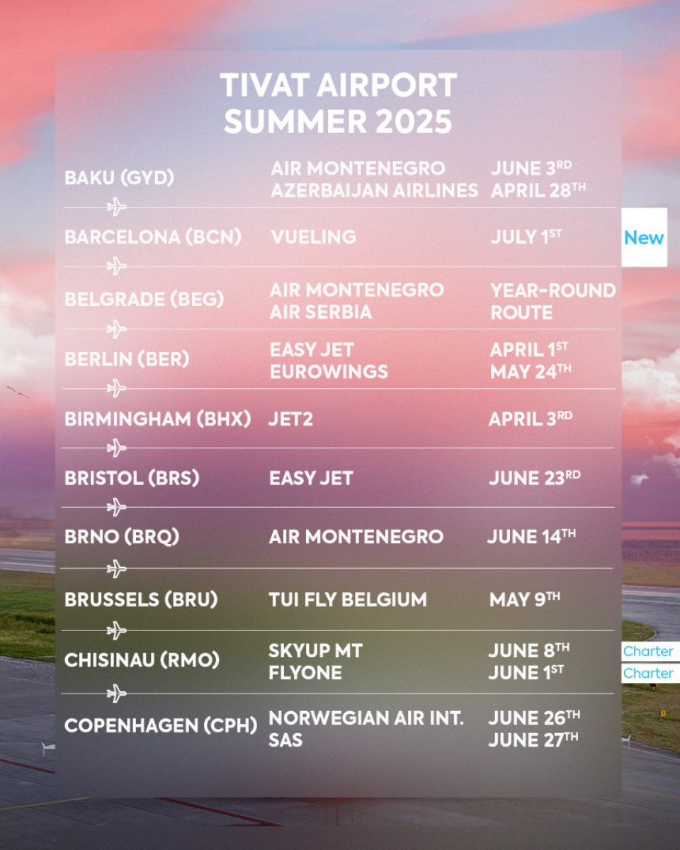 Prema najavama, na Aerodromu Tivat tokom ljeta biće aktivno oko 50 avio-linija, a najvažnija novost je to što španska niskobudžetna avio-kompanija Vueling prvi put dolazi u Crnu Goru i 1. jula otvara liniju Tivat-Barselona.