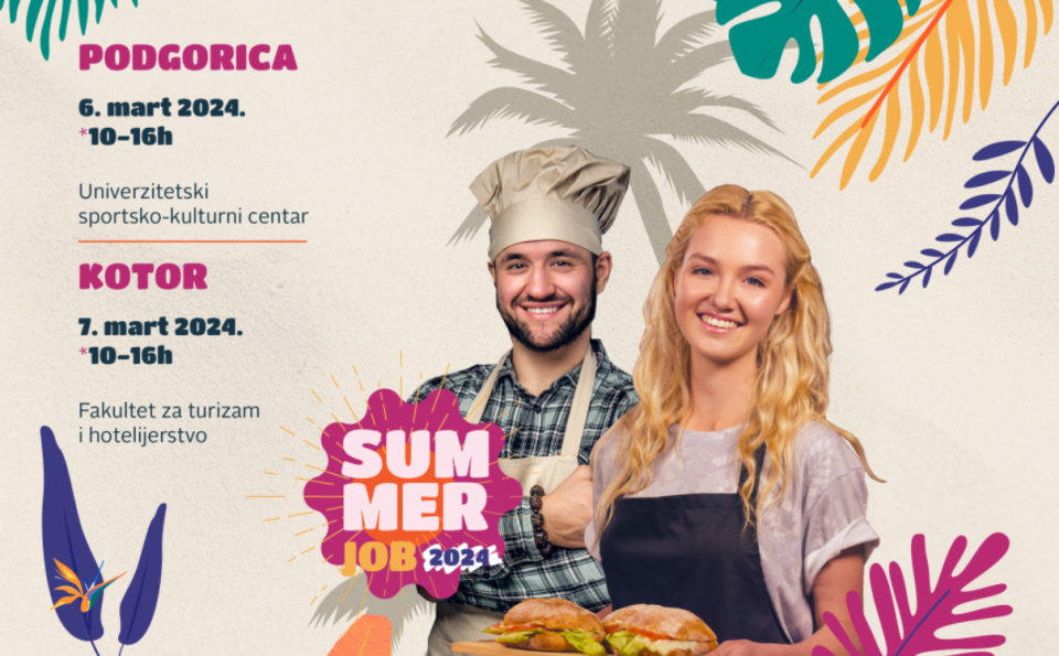 Sajam sezonskog zapošljavanja održaće se 6. marta u Podgorici u Univerzitetskom sportsko-kulturnom centru od 10-16h, a svoj nastavak će imati i sljedećeg dana, 7. marta, u Kotoru, na Fakultetu za turizam i hotelijerstvo UCG, u istom periodu.