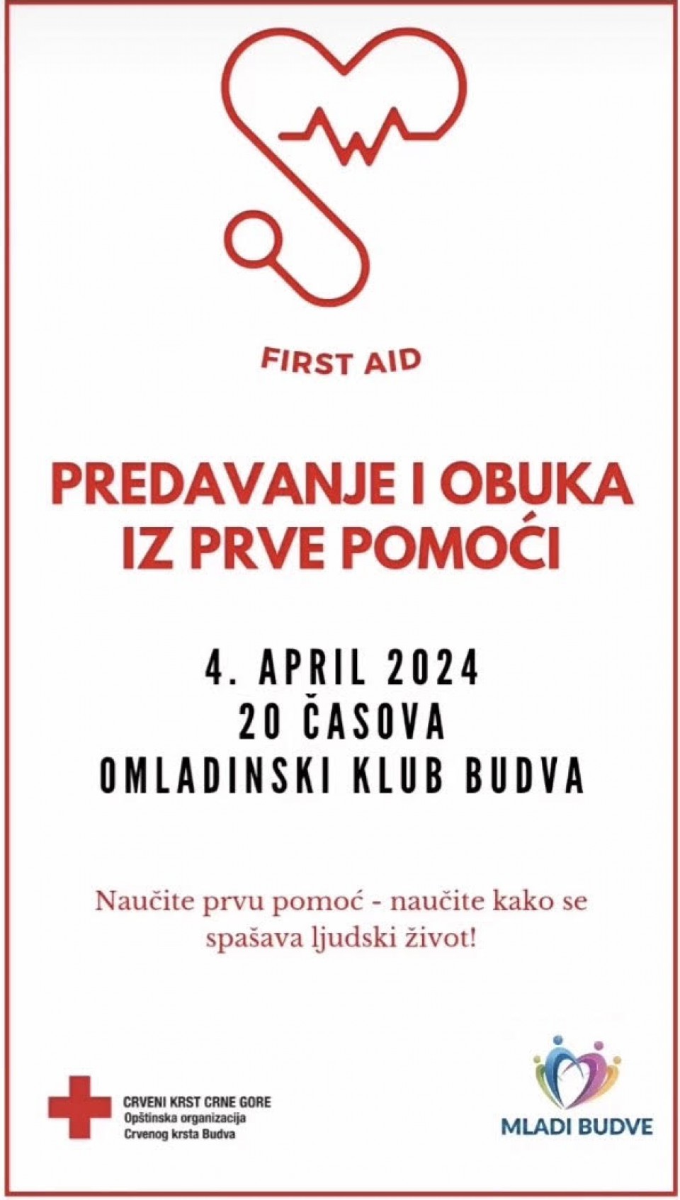 Omladinski klub Sekretarijata za društvene djelatnosti Opštine Budva, u saradnji sa Opštinskom organizacijom Crvenog krsta Budva, organizuje besplatno predavanje i obuku iz prve pomoći 4. aprila od 20 sati.