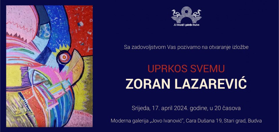 JU Muzeji i galerije Budve u srijedu, 17. aprila 2024. godine, u 20 časova u Modernoj galeriji „Jovo Ivanović” biti otvorena izložba „Uprkos svemu” Zorana Lazarevića. Kustos izložbe je Saša Radišić, akademski vajar.