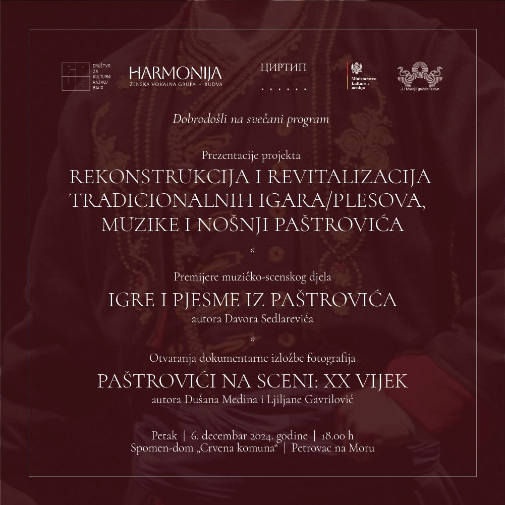 U Spomen-domu "Crvena komuna" sjutra u 18:00 biće predstavljen jedinstveni projekat "Rekonstrukcija i revitalizacija tradicionalnih igara/plesova, muzike i nošnji Paštrovića".