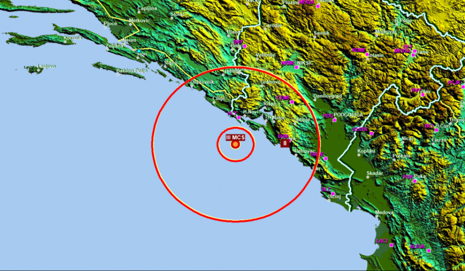 Slab zemljotres sa epicentrom na 21 km južno od Herceg Novog registrpvan je sinoć, 15 minuta nakon ponoćći,saopšteno je iz Sektora za seizmologiju Zavoda za hidrometeorologiju i seizmologiju.