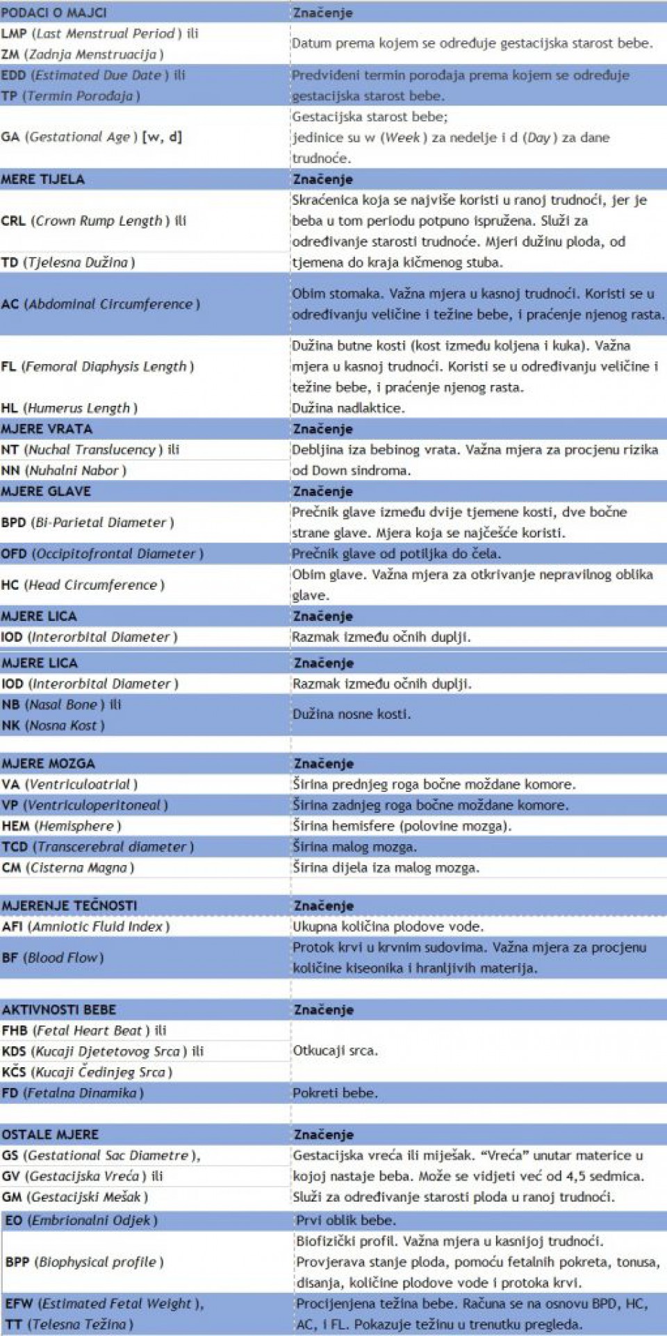 Sve vam se pomiješalo, dimenzije, skraćenice, prosječne vrijednosti… U tabeli koja je pred vama, a koju prenosimo sasjta Ringeraja, nalazi se većina skraćenica sa kojima ćete se susrijetati tokom ultrazvučnih pregleda u trudnoći.