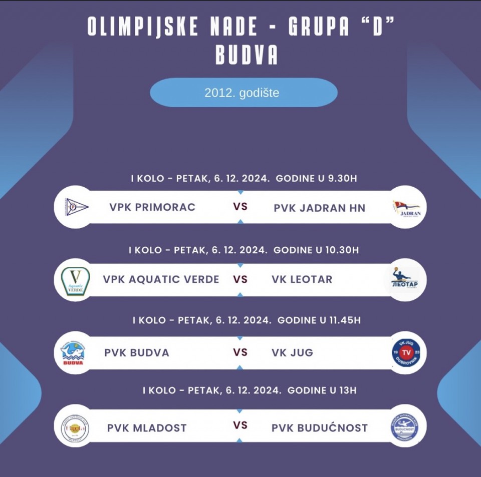 Od sjutra, pa sve do nedjelje, Budva će biti domaćin vaterpolo turnira "Olimpijske nade" za igrače rođene 2012. godine. Ovaj međunarodni događaj okuplja mlade talente iz regiona, a domaći klub, PVK Budva, imaće priliku da pokaže svoj kvalitet pred domaćom publikom.