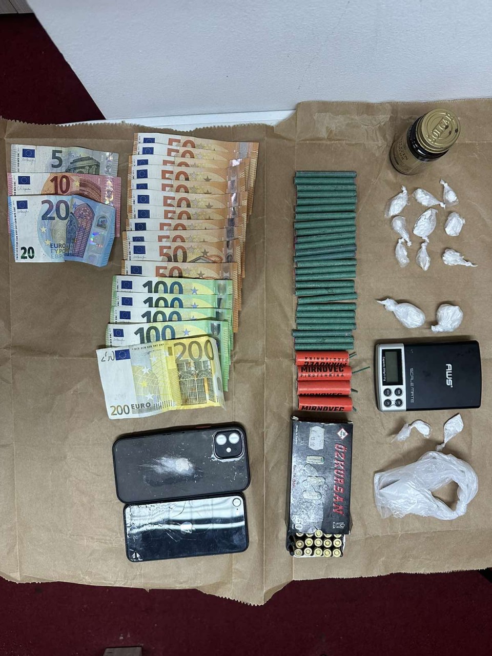 Kako navode, pronađeno je 1.185 eura, vaga za precizno mjerenje, 30 komada pirotehničkih sredstava, 15 komada municije za gasni pištolj kalibra 9 mm i dva mobilna telefona.