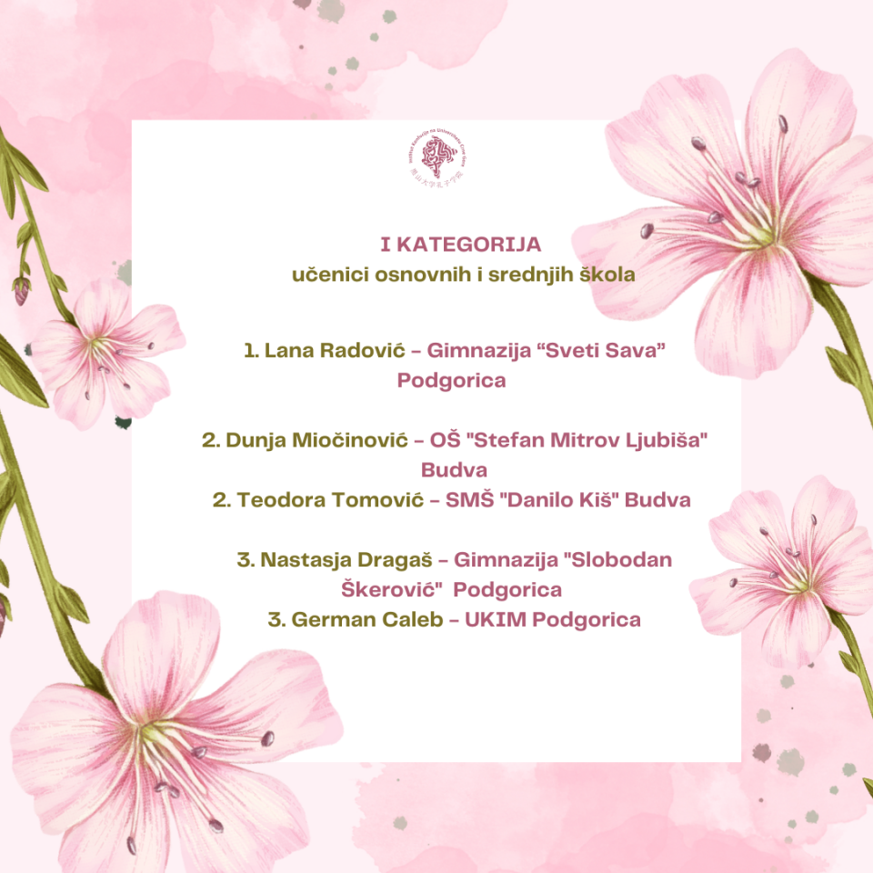 Njegujući talenat, kreativnost i tradiciju, Institut Konfucije u Crnoj Gori organizovao je konkurs posvećen tradicionalnoj kineskoj kaligrafiji, sa ciljem da osnaži vezu između umjetnosti i jezika, te podstakne mlade na izražavanje kroz ovu jedinstvenu formu umjetnosti, saopštili su iz Univerziteta Crne Gore.