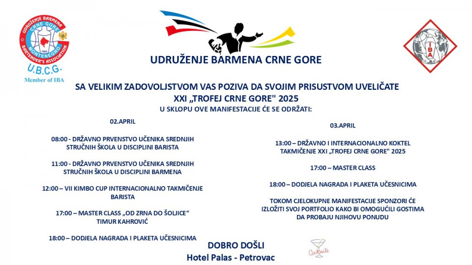 Udruženje barmena Crne Gore organizuje XXI „Međunarodni Trofej Crne Gore“ 2025, koji će se održati 2. i 3. aprila 2025. godine u prostorijama hotela Palas u Petrovcu.