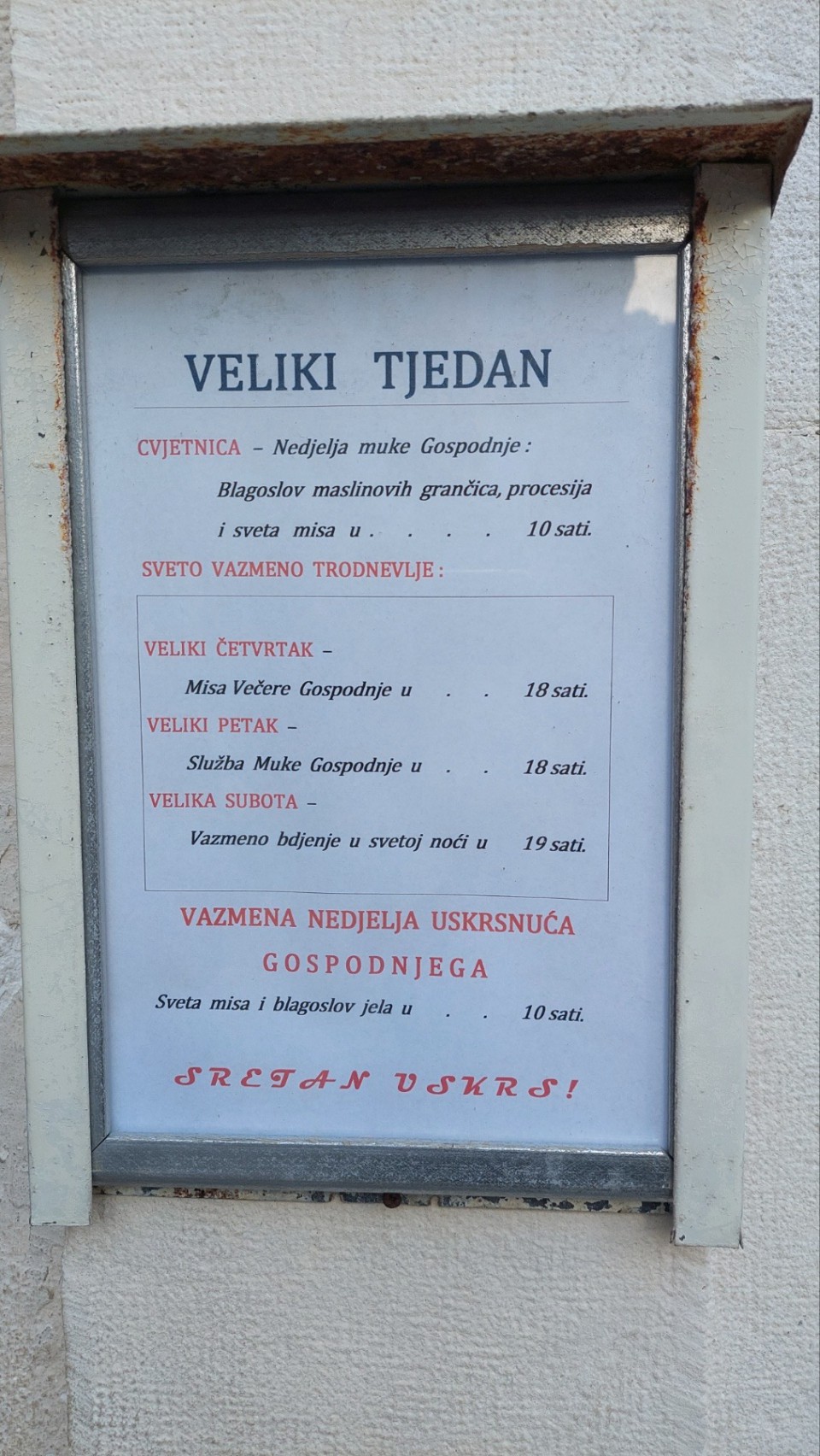 Raspored uskršnjih bogosluženja u katoličkoj crkvi Svetog Ivana u Starom gradu u Budvi.