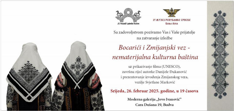 Izložba pod nazivom Bocarići i Zmijanjski vez – nematerijalna kulturna baština, biti zatvorena, uz prikazivanje filma (UNESCO), završnu riječ autorke Danijele Đukanović i prezentovanje izvođenja Zmijanskog veza vezilje Svjetlane Martinović, u srijedu, 26. februara 2025. godine u 19 časova u Modernoj galeriji „Jovo Ivanović